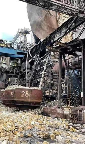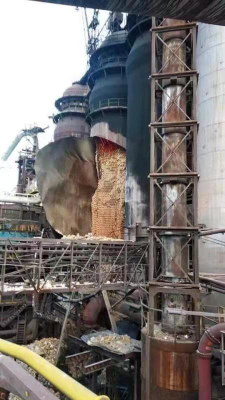 圖2捷克一鋼廠2000m3高爐頂燃式熱風爐于2021年12月初發生的驚天爐體大爆炸安全事故,爐殼炸開一個面積約100-150平方米的大洞,熱風爐蓄熱室數百噸1000多攝氏度高溫大墻磚和格子磚被炸出體外。