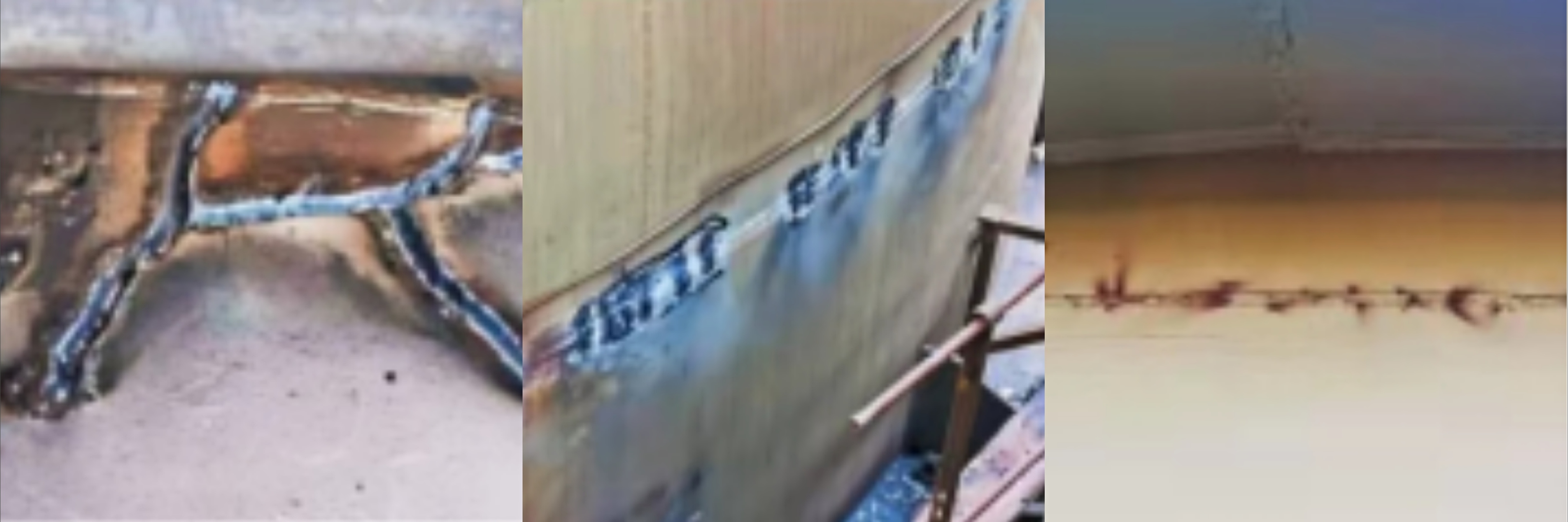 這三張圖是我國另一座高壓超高風溫頂燃式熱風爐預燃室爐殼焊縫兩邊母材脆裂、開裂現場狀況。