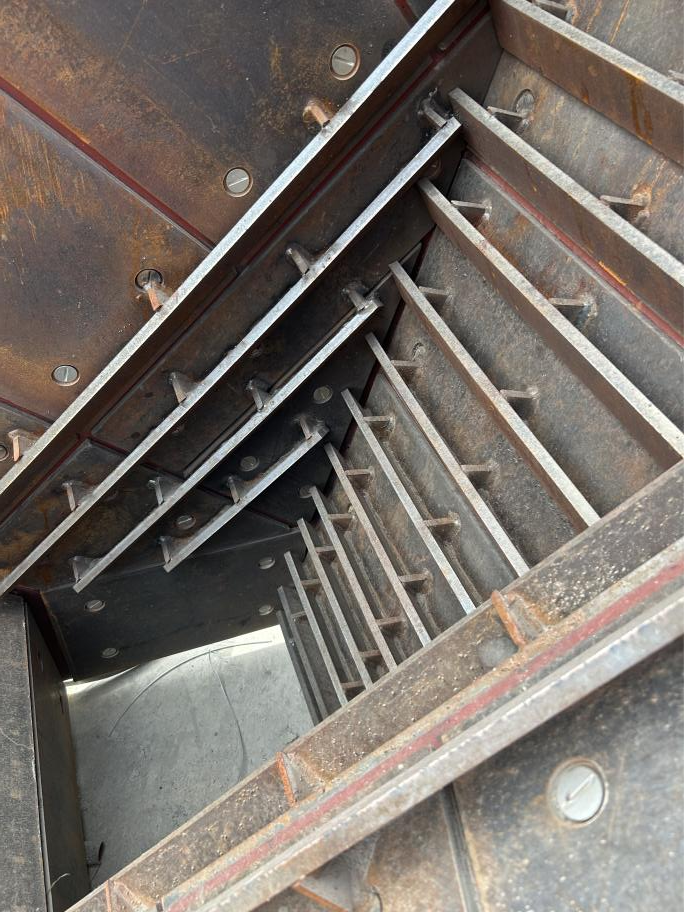 該結(jié)構(gòu)包括:位于落料點(diǎn)區(qū)域的卡槽結(jié)構(gòu)以及位于周邊區(qū)域的耐磨結(jié)構(gòu),耐磨結(jié)構(gòu)采用高強(qiáng)耐磨料填充,且在高強(qiáng)耐磨料內(nèi)部預(yù)埋有第一錨固件和網(wǎng)片,耐磨結(jié)構(gòu)還設(shè)有應(yīng)力消除裝置。其采用了卡槽結(jié)構(gòu)來(lái)積累物料,減小了物料對(duì)料倉(cāng)的沖擊;同時(shí)還減小鋼結(jié)構(gòu)倉(cāng)熱脹冷縮形成的應(yīng)力影響;提高了內(nèi)襯結(jié)構(gòu)附著力、穩(wěn)定性和機(jī)械強(qiáng)度,實(shí)現(xiàn)鋼結(jié)構(gòu)整體造襯,對(duì)鋼結(jié)構(gòu)內(nèi)壁形成更有效的防護(hù);其具有簡(jiǎn)單快捷,效率高,防護(hù)功效強(qiáng)的優(yōu)點(diǎn)。(北京聯(lián)合榮大工程材料股份有限公司專(zhuān)家組)