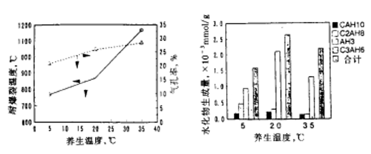 由以上爆裂機理可以看出,影響材料防爆性能的因素主要有材料的透氣性和材料本身的強度。對于高爐爐身中上部而言,一般采用水泥作為材料的結合劑,在水泥水化的過程中,其養生溫度對水化產物及材料的氣孔率都有較大的影響,實驗結果如下圖所示。