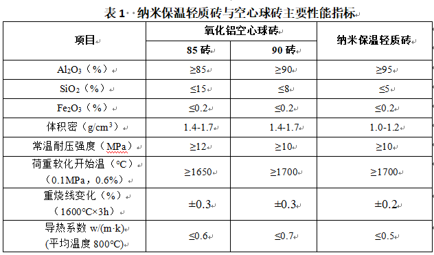 針對以上情況,北京聯合榮大工程材料股份有限公司研發使用納米硅溶膠作為結合劑,采用吸濾成型方法,制備出高強度納米保溫輕質磚(如圖1),可直接用于高溫窯爐的工作部位,降低窯爐的材料用量,提高窯爐的熱效率??扇〈壳捌毡槭褂玫难趸X空心球磚,該材料比氧化鋁空心球磚體密小、強度高,能夠應用于1400~1500℃的高溫環境下,比市場上其他的納米輕質絕熱材料使用溫度高。納米保溫輕質磚與空心球磚主要性能指標見表1。