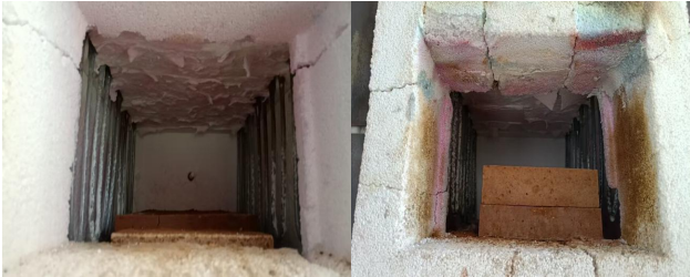 使用納米保溫輕質磚和傳統空心球磚砌筑的高溫加熱爐內襯,在經過3個月使用后,空心球磚發生開裂,破損嚴重,聯合榮大研發的新型納米保溫輕質磚狀態良好,未發生破損開裂(如圖2)。