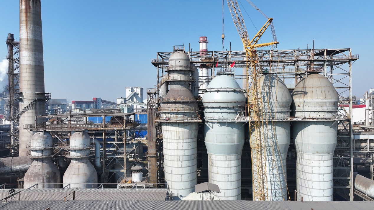 圖為滄州中鐵裝備制造材料有限公司3座2500m3高爐9座小帽子頂燃式熱風爐經切割爐殼成功改造為豫興四段式頂燃式熱風爐群