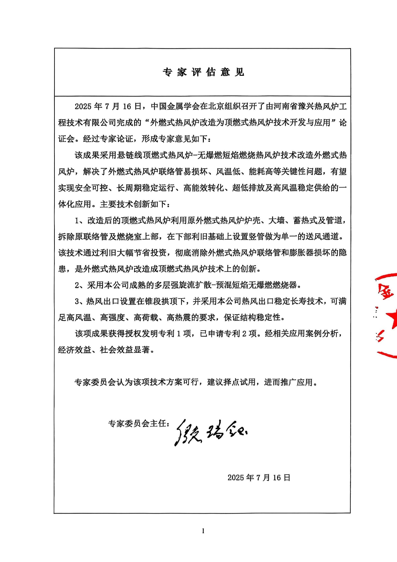 2025年7月16日,中國金屬學會在北京組織召開技術論證會,對河南省豫興熱風爐工程技術有限公司(下文簡稱豫興公司)完成的,“懸鏈線頂燃式熱風爐-無爆燃短焰燃燒技術開發與應用”、“四段式頂燃式熱風爐技術開發與應用”,以及“外燃式熱風爐改造為頂燃式熱風爐技術開發與應用”這三項成果進行評審,并展開深入論證。專家們得出的一致結論是:這三項豫興頂燃式熱風爐技術推廣前景廣闊!