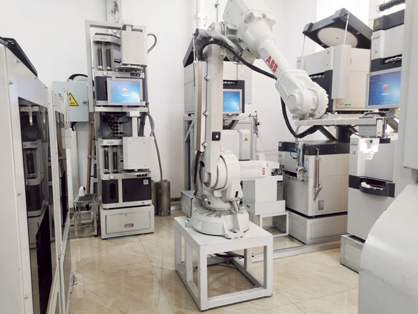 我和工友們主要負責公司所有進廠原燃料、合金、輔料、熔劑、中間產品及公司二級單位所送試樣等化學分析檢測、外部客戶試樣的化學分析以及化學仲裁檢測。我的材質是鋼。身體由2臺稱量儀、2臺測硫儀、3臺水灰檢測儀、2臺揮發分檢測儀、1臺灼燒儀和1臺ABB機器人組成。我每天的主要工作是完成公司所有煤焦的工業分析、干基硫的分析檢測,真可謂任務艱巨、責任重大、使命光榮。