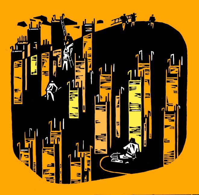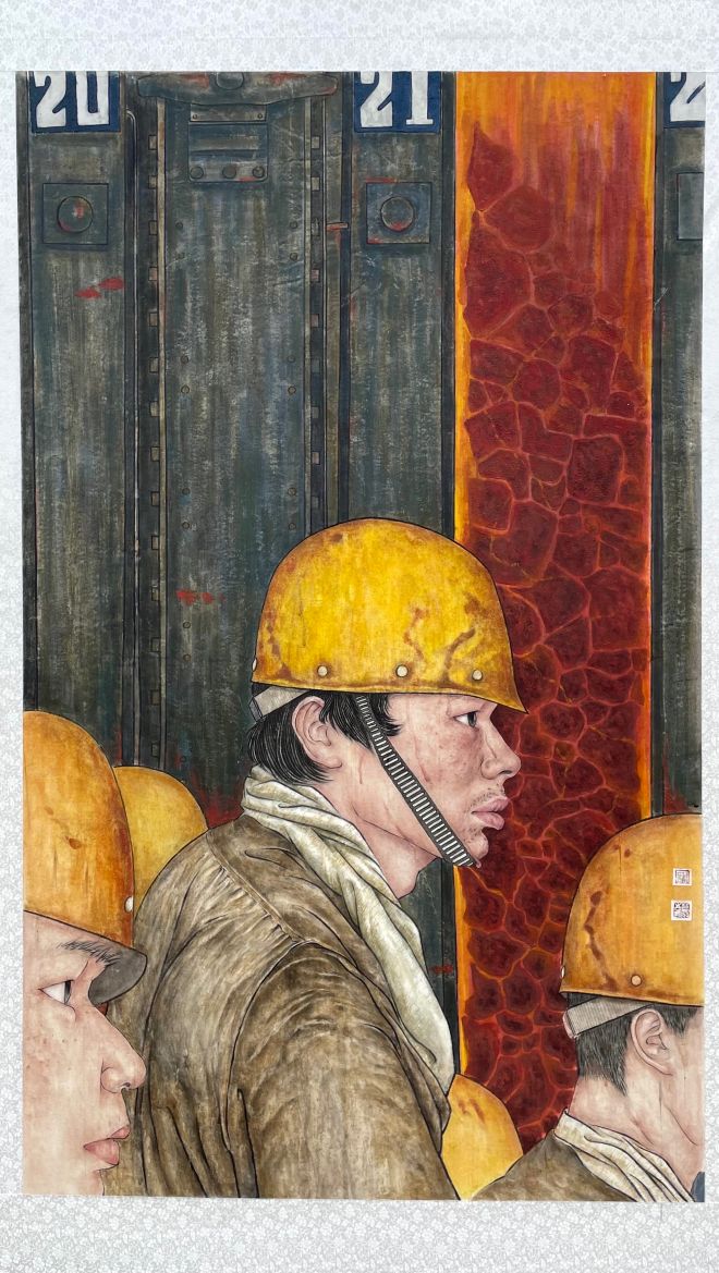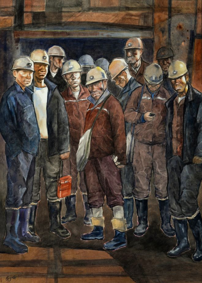 《升井的礦工》水彩 郭建國(梅鋼)